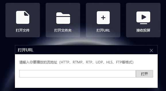 播放方式是在播放器中点击 “打开 URL”,在弹出的窗口中粘贴链接, 然后点击打开即可播放,由于网络视频位于远端服务器,所以播放效果受到你和服务器之间的网络状况影响较大。